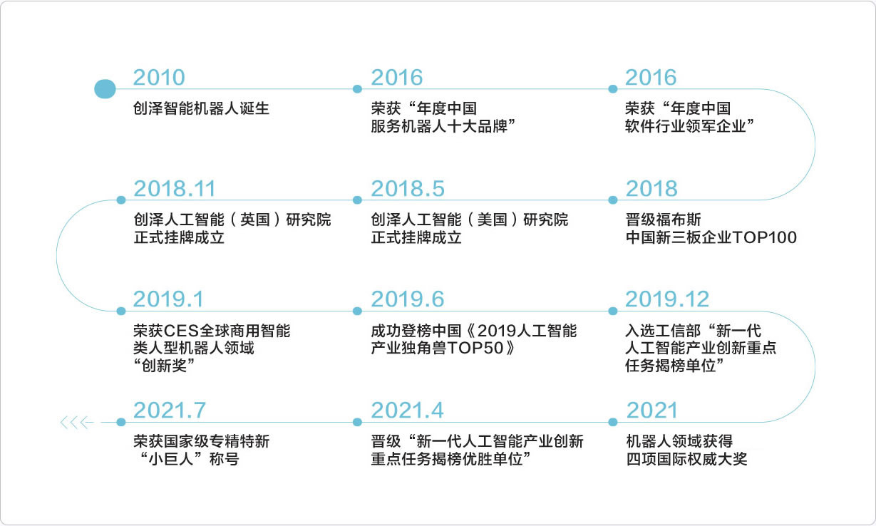 創(chuàng )澤智能機器人集團股份有限公司成立于2010年,是集研發(fā)、生產(chǎn)、銷(xiāo)售于一體的國家高新技術(shù)企業(yè)、是工業(yè)和信息化部“新一代人工智能產(chǎn)業(yè)創(chuàng )新重點(diǎn)任務(wù)”揭榜單位與優(yōu)勝單位、榮獲吳文俊人工智能科技進(jìn)步獎、國家專(zhuān)精特新“小巨人”稱(chēng)號,擔負著(zhù)為國家開(kāi)展智能公共服務(wù)機器人項目技術(shù)攻關(guān)的使命。全球榮獲CES創(chuàng )新獎的商用類(lèi)人型智能服務(wù)機器人企業(yè)、中國智能服務(wù)機器人領(lǐng)軍企業(yè)。