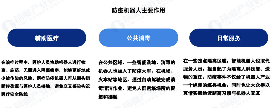 防疫機器人在醫療L域的應用場(chǎng)景主要為:機器人替代醫護人員完成消毒、導診、送藥等工作,疫情下,不同種類(lèi)的防疫機器人在醫院場(chǎng)景中承擔不同的功能